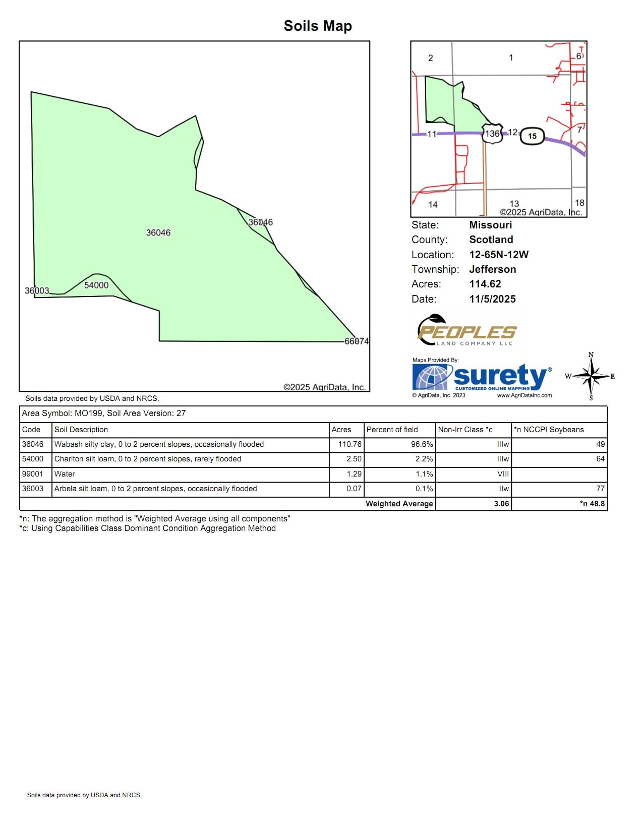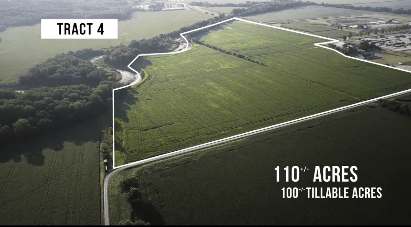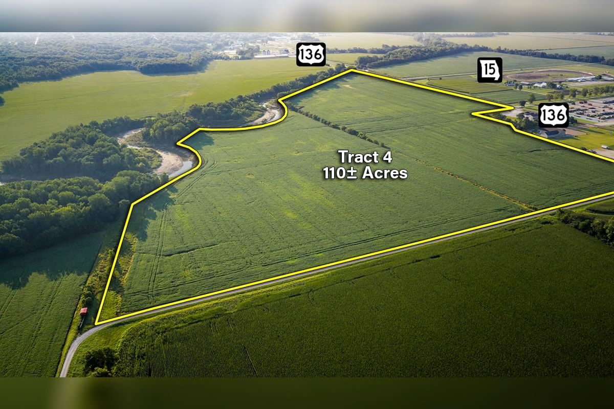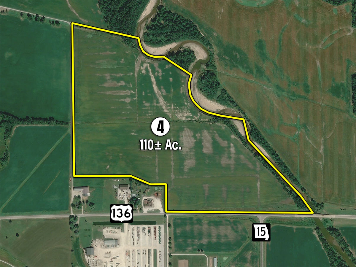 Tract 4: 110± acres with approximately 100 tillable acres. Prime highway frontage along Hwy 136, making it ideal for agricultural or commercial use. Soil types include Wabash and Chariton.