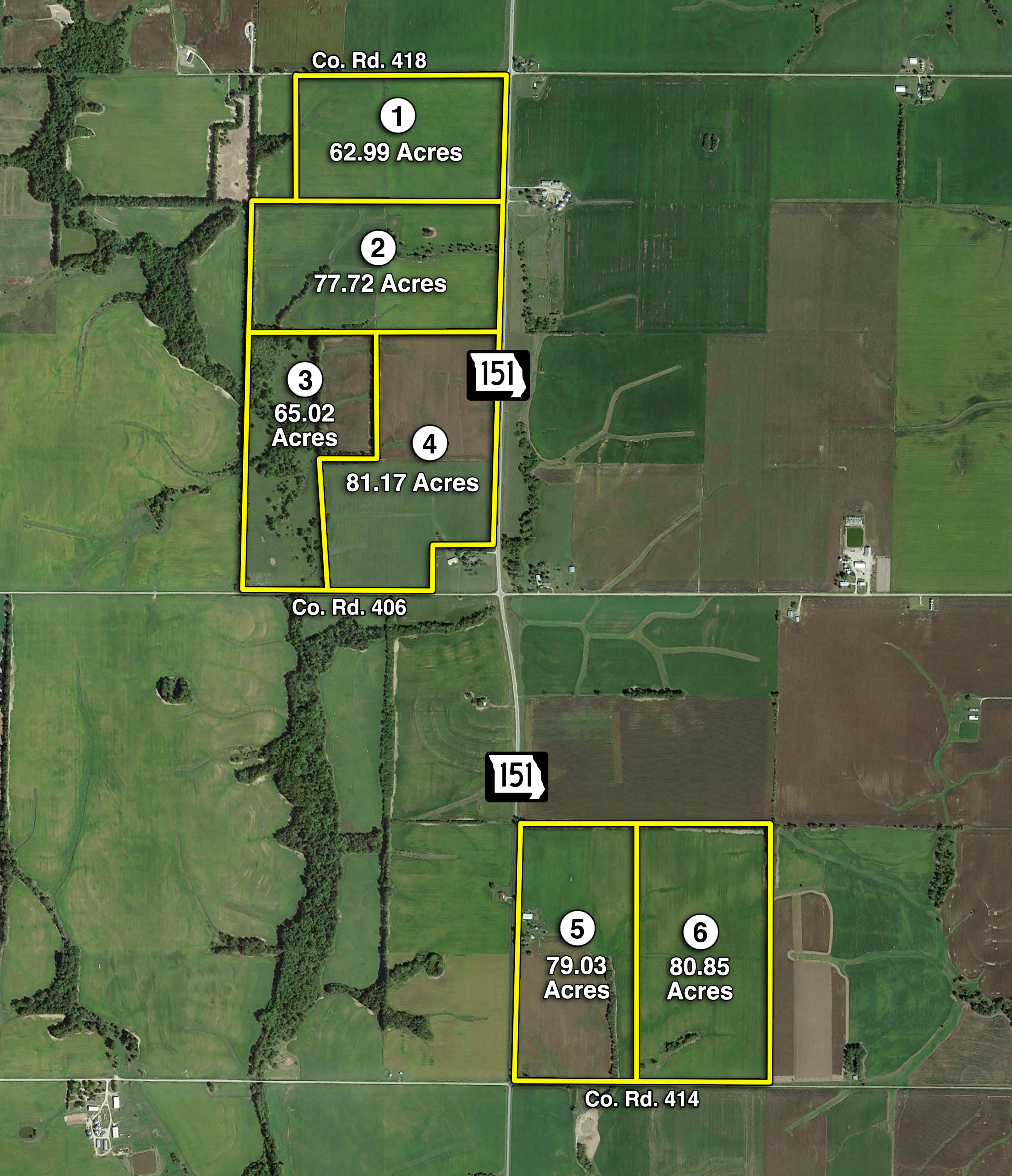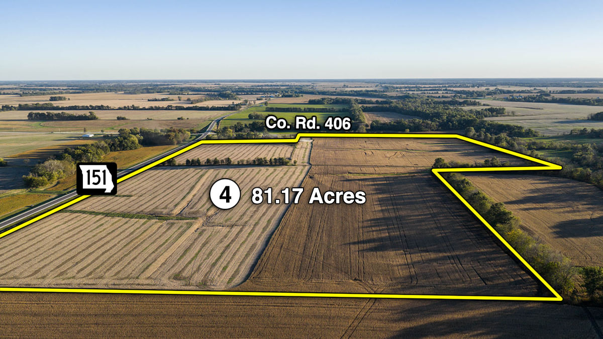 Tract 4: Consists of 81.17 surveyed acres m/l with approximately 74FSA tillable acres m/l making it 92% tillable. Has highway frontage along Highway 151 and county road frontage along Shelby 406. Soil types consist of productive Putnam, Mexico, or Leonard soils.